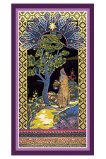 Carrying his beautiful but strangely lit lantern, the Hermit walks the enlightened path of wisdom. He travels alone at night when both his robes and the dark conceal him, for his teachings are only for those who seek him out. The Hermit is a teacher who has attained his profound understanding by withdrawing from the distractions of the world, in order to better contemplate the world of the mind. This kind old sage retains the wisdom of the past but is open to the ideas of the future. All of Nature takes on a special glow, revealing its secrets to The Hermit's gentle curiosity. He is a peaceful, open-minded guide, and counselor. Circumspect and introspective, he does not rush to take action or pass judgement. His advice will not be forthcoming without much consideration. A double star shines upon his path, providing the light of the conscious and unconscious minds, which are the sources of all knowledge. If this solitary giver of wisdom is followed with reverence and without desire for materialistic goals, he will shed much light on any problem.