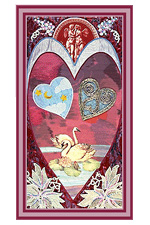 Two beautiful white swans circle in a calm stream among drifting water lilies. Mated for life, they symbolize the eternal unifying power of love to dissolve the differences of male and female and form a union where each partner's experience is highlighted because of the love and life shared with the other. There is perfect equality in the knowledge of both that they are special to each other. This card shows a romantic trysting place where lovers might meet without fear of discovery. It is a fairyland far from everyday concerns and pressures, where love is cherished and encouraged. Here cupids and white flowers decorate the top of the large heart-shape and hint of a wedding cake and marriage. One of the smaller, floating hearts seems to illustrate that love is written in the stars whilst the other, with its elegant and graceful curves, suggests joyful play and sociability. These two hearts beat as one.