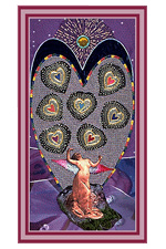 A winged woman tries to gather seven brightly pulsating energy-hearts that have been caught on a net encircled by all the colors of the rainbow. Symbolized here are the worlds of imagination, inspiration, and, above all, illusion. The whole of the material world is represented as pure energy, trapped in the net of form and radiating an infinite number of colors, smells, sounds, and other properties, giving the illusion that this interconnected world holds an infinite variety of all things. This is why the woman wears the wings of fantasy. She believes that this is the true nature of physical reality and therefore anything must be possible. In this dreamlike world she may become addicted to the glamour and intoxication born of illusion and may become overwhelmed by its implications, preventing her from functioning in her everyday life. Then she will be as trapped as the netted hearts. A magic shell-sun above her radiates the higher truth. She must face ultimate reality with her head to the sky but with her feet on the ground. Only then will her visions and the art born of them be of benefit to her.